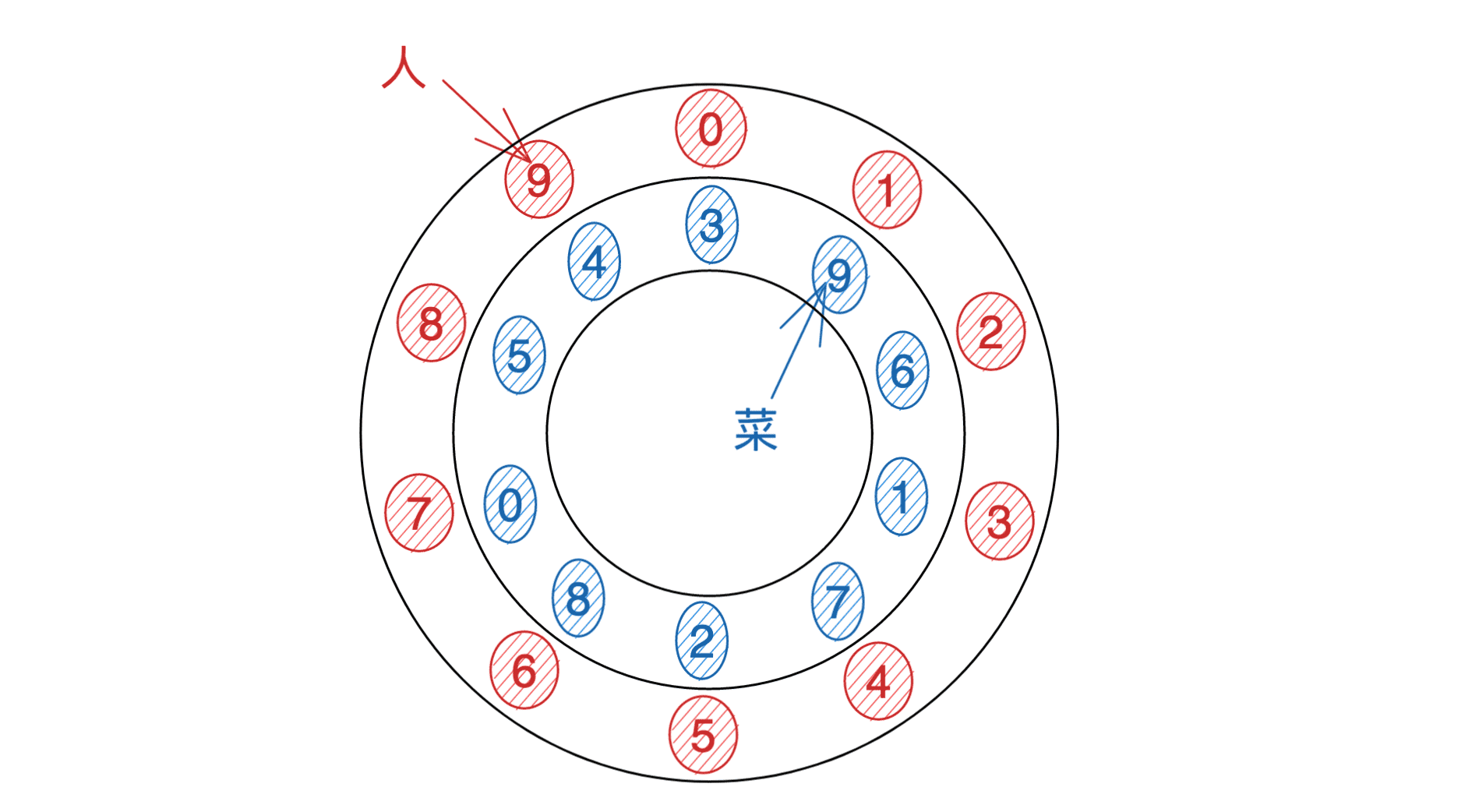 首先抽象一下题意:n 个人和 n 道菜分别呈环状排列,如下图: